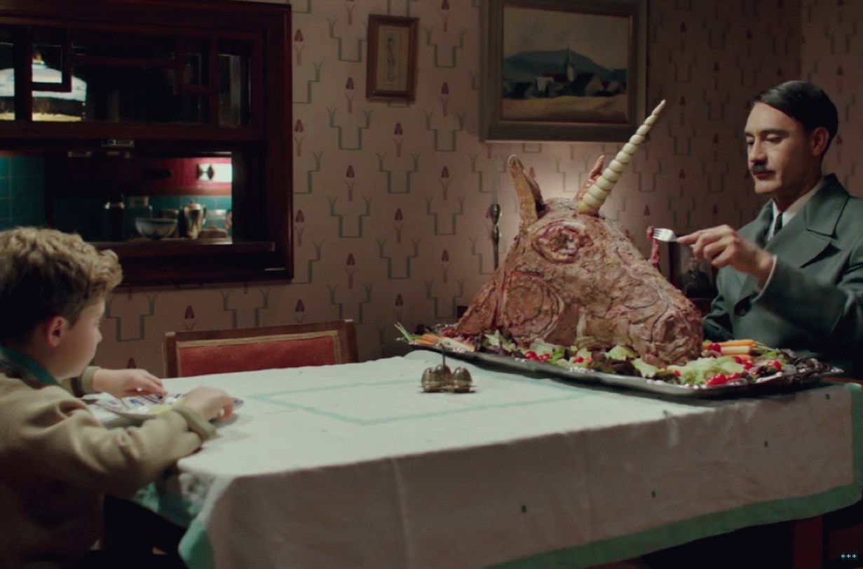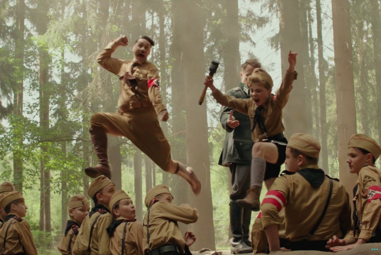 Prvi uradni dražljaj je padel julija, odpiral se je pri nekaterih dobro staromodno klofuto v tem Hitlerjevem mladinskem taboru, da nam je dal okus celotnega tona filma. Jojo muči drugi otroci v taborišču, ker so bili malo prevarani – od tod tudi njegov vzdevek, “Zajec.” Njegov zamišljeni BFF, Adolf, mu zagotavlja, da so ljudje govorili ves čas tudi o njem grde stvari: “Oh, norec je. poglejte tega psiho, vse nas bo dobil ubit! «(Waititi je rekel, da je Adolf v bistvu a nadomestek za odsotnega fanta očeta.)